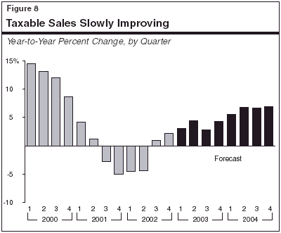 Taxable Sales Outlook—Accelerating Growth in Late 2003. We forecast that taxable sales will continue to grow at a sluggish and uneven pace in early 2003, reflecting continued softness in business-related spending, and some retrenchment in auto sales. We expect sales to gain momentum in the second half of the year, as business spending begins to accelerate. Overall, we forecast that taxable sales will increase by 3.6 percent for 2003 as a whole and 6.5 percent in 2004, or roughly in line with personal income growth for the two years.