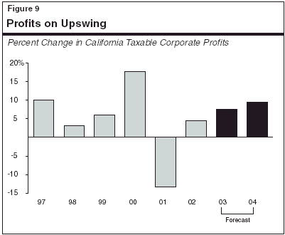 Looking ahead, we forecast that taxable California profits will increase by 7.5 percent in 2003 and by 9.5 percent in 2004 (see Figure 9, next page). While sales and production will likely be restrained in the first half of 2003, we believe that companies will continue to benefit from cost-savings actions taken over the past 12 months. We then expect that profits will improve significantly in the second half of the year when sales and output pick up.