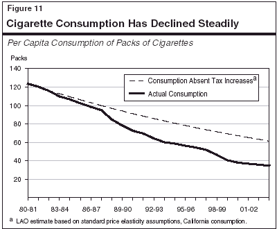 Due to a variety of factors, the per capita consumption of cigarettes in California has trended downward over the last 20 or so years. As shown in Figure 11 (see next page), per capita cigarette consumption in the state has declined from 124 packs annually in 1980-81, to an estimated 35 packs annually in 2003-04. The number of packs consumed in California dropped from a peak of 2.9 billion in 1980-81 to an estimated 1.2 billion in 2002-03. This drop occurred despite the fact that California's population grew by roughly 50 percent over the same period.