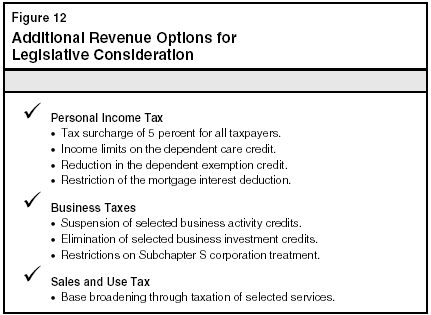 There are a number of other general approaches the Legislature could consider in terms of revenue options, whether to fund realignment or more directly address the budget shortfall. While the Governor's proposals are strictly limited to raising rates on existing taxes, there are a number of alternatives the Legislature could consider, including broadening tax bases and restricting certain tax programs. Figure 12 shows some of the general alternatives that the Legislature could consider.