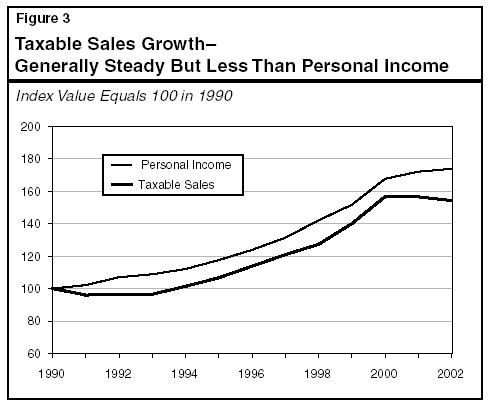 Growth. Figure 3 shows the overall growth of taxable sales compared to the state's personal income for the period 1990 through 2003. The annual average growth in taxable sales over this period was approximately 3.7 percent, compared with the overall growth rate in personal income during the same period of roughly 4.6 percent annually.