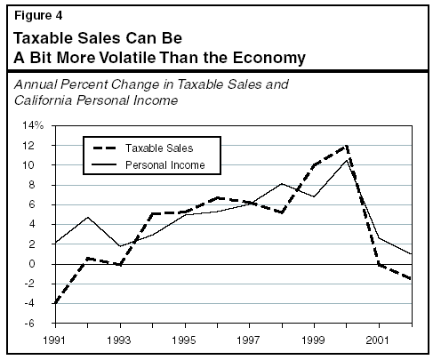 Volatility. Taxable sales exhibit moderate volatility, having fluctuated a bit more than personal income over the last decade. They have been less volatile than some other tax bases upon which the state relies—for example, taxable personal income and corporate profits. Figure 4 (see next page) indicates annual percent changes in taxable sales over the last decade or so and the corresponding changes that have occurred with respect to personal income in California. As shown in the figure, taxable sales oftentimes outperform the economy in an expansion period and under-perform during periods of contraction.