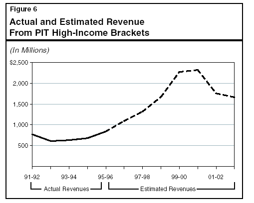 High-Income PIT Growth. Between 1991 and 1995, California had 10 percent and 11 percent brackets in place similar to those proposed by the Governor. Figure 6 indicates the actual revenue that was raised from these higher income brackets during the fiscal years for which they were in effect (1991-92 through 1995-96) and an estimate of the revenue that would have been raised from these brackets had they continued to exist through 2002-03. The revenue that would have been associated with these high-income brackets grew considerably over the period—at an approximate annual rate of 13 percent through 2000-01. However, revenues from the high-income brackets would have declined significantly in the last two years, making the annual growth rate over the entire period equal to 7.2 percent.