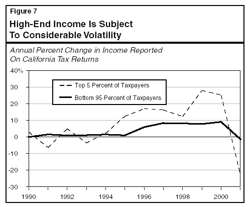 Indicators of Volatility. The above growth rates obscure the significant degree of annual fluctuation in revenues generated from these top PIT brackets. As shown in Figure 7 (see next page), over the entire period of the 1990s high-income taxpayers experienced significant changes in personal income relative to other taxpayers. For example, income increased by 28 percent for high-income taxpayers in 1999, but by about 8 percent for all other taxpayers. Similarly, in 2001, income associated with high-income taxpayers dropped by over 22 percent compared to a decline of only slightly more than 1 percent for all other taxpayers.
