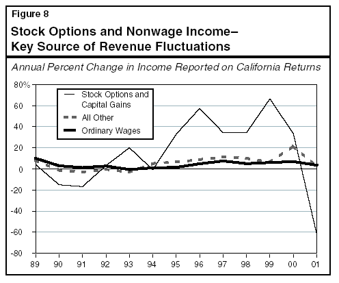 The greater volatility at the high end of the income spectrum is largely the result of stock options and certain nonwage income received by this group. Many components of nonwage income fluctuate enormously depending upon economic conditions and taxpayer decisions. For instance, those business profits that are taxed under the PIT tend to swing more than most other forms of income. Similarly, capital gains—which comprised a significant component of high-income taxpayers' nonwage income in the late 1990s—are subject to enormous and frequent swings. The volatility of ordinary wage income compared to these more volatile other income sources is shown in Figure 8.