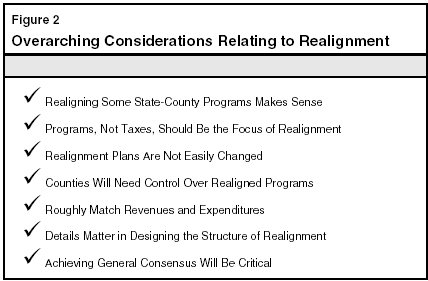Before reviewing the individual components of the administration's realignment plan, we recommend that the Legislature consider several matters relating to the realignment package as a whole. Figure 2 summarizes these considerations, which we discuss separately below.