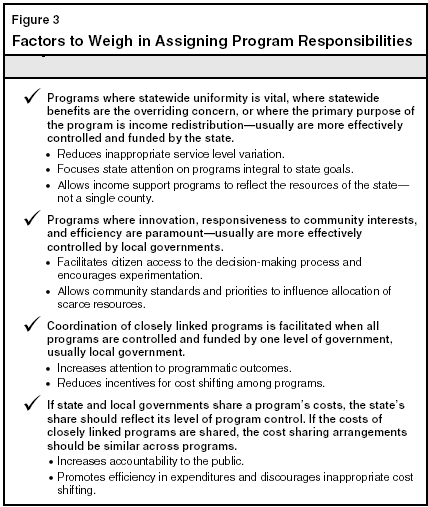 Given this, which programs should the state control and which should counties control? There is no "right" answer to this question. To assist the Legislature in its decision making, we highlight several factors, summarized in Figure 3 (see next page), for the Legislature to weigh as it reviews the assignment of program responsibilities.