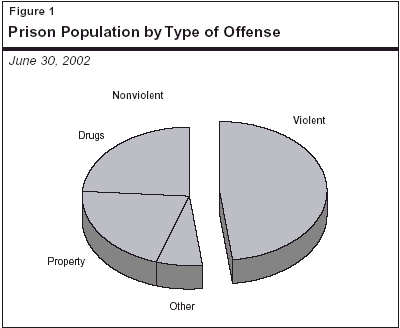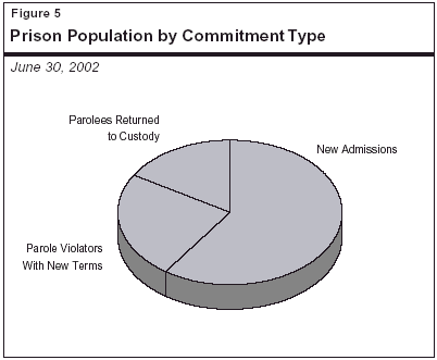 Figures 1 through 5 illustrate the characteristics of the state's prison population, which was 157,979 as of June 30, 2002. About 94 percent of the population is male. The charts show:
