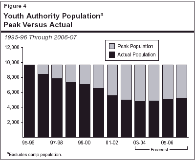 Historically Projections Higher Than Actual Population. In recent years, Youth Authority projections have tended to be somewhat higher than the actual population, leading to downward revisions for the future projected population. For example, the June 30, 2002 institutional population projection dropped by 83 wards from 5,930 in the spring 2002 projections to the actual population of 5,847.
