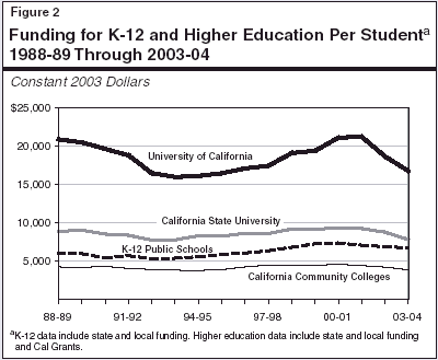 To place funding for K-12 and higher education into an historical perspective, we have compared state and local funding per FTE student in the four public segments from 1987-88 through 2003-04, adjusting for the effects of inflation over this 17-year period (see Figure 2). As the figure shows, per-student funding for K-12 schools remains near the high point for this period. Per-student funding for higher education declines from historic highs in the past two years, although much of this decline is offset by student fee increases.