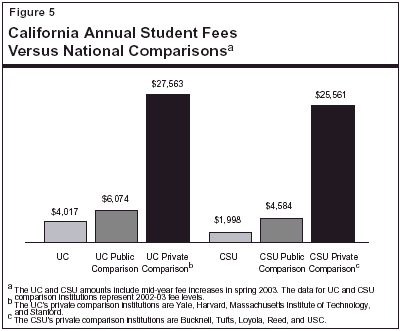 Fees Are Well Below the Segment's National Comparison Institutions. As Figure 5 shows, total student fees at UC and CSU are substantially lower than the average of the public and private institutions to which UC and CSU are compared when evaluating faculty salaries. The average resident student fee at UC's four public comparison institutions in 2002-03 is $6,074, which is almost one-third greater than UC's. The UC fee is well below the $27,563average of fees charged by its four comparison private institutions—Yale, Harvard, Massachusetts Institute of Technology, and Stanford. At CSU's 15 public comparison institutions, the average student fee of $4,584 is more than double CSU's 2002-03 fee of $1,998.