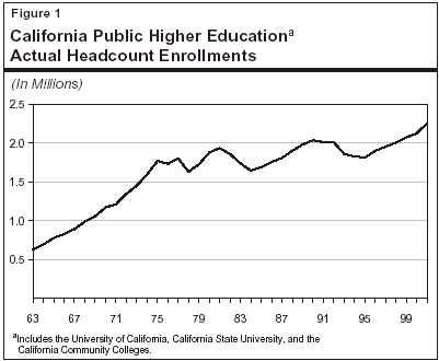 In 2001, approximately 2.3 million students ("headcount enrollments") were enrolled either full-time or part-time at CCC, CSU, and UC. This is equal to roughly 1.6 million full-time-equivalent (FTE) students. (We describe the differences between headcount and FTE in the accompanying text box on page 28.) Figure 1 summarizes actual headcount enrollments from 1963 to 2001 for the state's public colleges and universities. The figure shows that enrollment grew rapidly through 1975, fluctuated up and down over the next two decades, and has grown steadily since 1995. Total enrollment in 2001 was 354,712 (or about 19 percent) more students than in 1990.