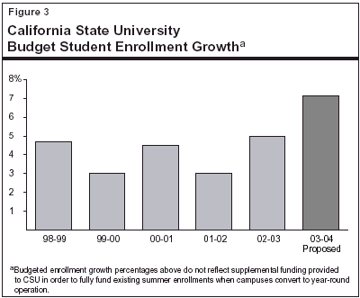 Highest Budgeted Enrollment Growth in Recent History. Figures 2 and 3 show UC and CSU's budgeted enrollment growth for each of the past five years and proposed enrollment growth for next year. From 1998-99 through 2002-03, UC and CSU received an average of about 4 percent for annual budgeted enrollment growth. As indicated in the figures, the Governor's budget proposes enrollment growth rates—6.9 percent at UC and 7.1 percent at CSU—that far exceed recent practice. For example, the state provided funding in the current year for increased enrollments of 4.3 percent at UC and 5 percent at CSU. In fact, based on historical data from UC, the proposed 6.9 percent enrollment growth for the system would be the highest in 25 years. At the time of this analysis, CSU was unable to provide data on budgeted enrollment growth prior to 1982-83. However, available data indicate that 7.1 percent would be the highest in at least the past 20 years.