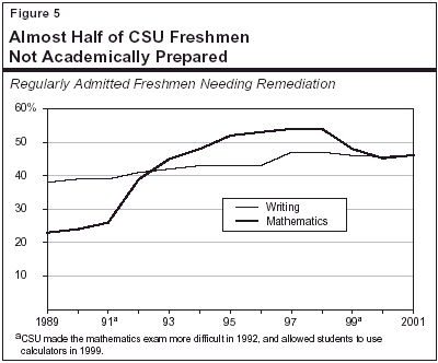 Almost Half of Regularly Admitted CSU Students Arrive Unprepared for College Writing and Mathematics. The CSU annually reports on the proportion of freshman that arrive unprepared for college-level work. Figure 5 shows the CSU systemwide unpreparedness rate in writing and mathematics for regularly admitted freshmen over the last decade. In fall 1989, 38 percent of regularly admitted freshmen were unprepared for college-level writing and 23 percent were unprepared for college-level mathematics. By fall 2001, the unpreparedness rate in writing had increased to 46 percent. The unpreparedness rate in mathematics also increased sharply between 1989 and 1998—when 54 percent of regularly admitted freshmen arrived unprepared. Over the last three years, however, the unpreparedness rate in mathematics has fallen to 46 percent in fall 2001.
