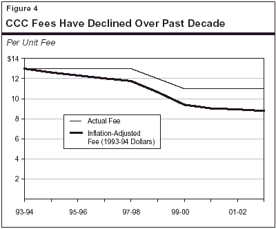 This would be the first fee increase for community college students in a decade. The last increase was in 1993-94, when the state raised fees from $10 per unit to $13 per unit. Since that time, the CCC fees have been reduced in two steps to its current rate of $11 per unit. Figure 5 shows the changes in fees during this period, both in actual dollars and 1993-94 dollars.