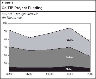 From 1997-98 through 2001-02, $25 million from the General Fund has supported 145 CalTIP projects. The typical CalTIP award is about $200,000. Businesses awarded state funding have also received $108 million in federal grants and $100 million from private sources (including the businesses themselves) to support their projects—for a total of $233 million in project funding. Thus, on average, the state has provided 11 percent of funds, compared to 46 percent from the federal government and the remaining 43 percent from private funds. Figure 4 shows the funding split over the previous five years.
