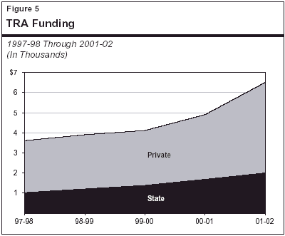 From 1997-98 through 2001-02, RTAs received $7 million in state support and $16 million from private sponsors. In other words, the state has provided 32 percent of RTA funding on average, while private sources have provided the remaining 68 percent. Figure 5 shows the funding split over the previous five years.