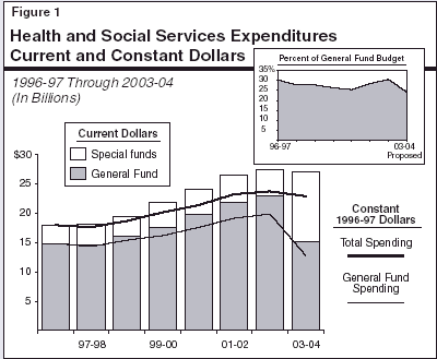 Historical Trends. General Fund support for health and social services programs has been growing steadily since 1996-97. This growth trend would largely be negated by the major reduction in General Fund spending for these programs proposed for 2003-04. Consequently, General Fund expenditures (current dollars) for health and social services programs in 2003-04 would be at about the same level as in 1996-97, as Figure 1 shows.