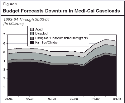 Medi-Cal Caseloads. As shown in Figure 2, the Governor's budget plan assumes that a significant decline in caseload will occur during the budget year in the Medi-Cal Program. Specifically, the overall caseload is anticipated to decrease by about 210,000 eligibles, or 3.3 percent, during 2003-04 compared to the estimated current-year caseload. This would reverse a trend of significant caseload growth in the program during the past couple of years.