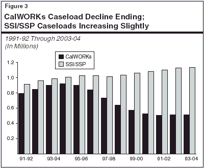 The CalWORKs and SSI/SSP Caseloads. Figure 3 shows the caseload trend for CalWORKs and SSI/SSP. While the number of cases in SSI/SSP is greater than in the CalWORKs program, there are more persons in the CalWORKs program—about 1.4 million compared to about 1.1 million for SSI/SSP. (The SSI/SSP cases are reported as individual persons, while CalWORKs cases are primarily families.)