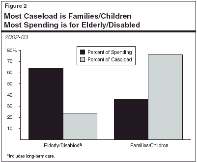 The average cost per eligible for the aged and disabled Medi-Cal caseload (including long-term care) is much higher than the average cost per eligible for families and children on Medi-Cal. As a result, almost two-thirds of Medi-Cal spending is for the elderly and disabled, although they account for only about one-fourth of the total Medi-Cal caseload, as shown in Figure 2.