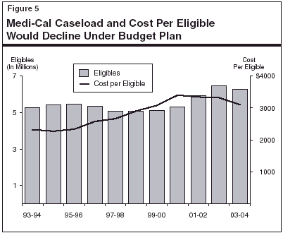 Most of the reduction in General Fund spending is based upon an assumption in the Governor's spending plan that about $3 billion in Medi-Cal expenditures will be shifted to the counties—along with revenues—as part of a larger realignment of state and county funding and program responsibility. This includes shifting to the counties 15 percent of the nonfederal cost of Medi-Cal health care services ($1.6 billion) and all nonfederal costs for Medi-Cal long-term care ($1.4 billion). The realignment proposal is discussed in more detail in "Part V" of The 2003-04 Budget: Perspectives and Issues.