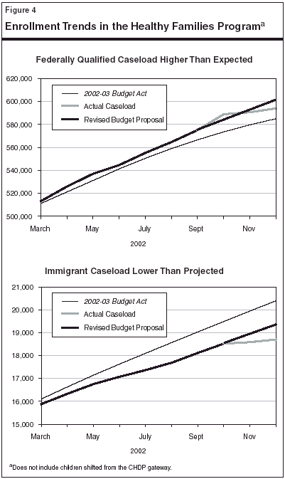 As the figure shows for this period, the number of federally qualified children who have been enrolling in Healthy Families is above the level assumed in the 2002-03 Budget Act, while the number of immigrant children is somewhat below the level that was budgeted last year. The administration has revised its current-year caseload estimates in its proposed budget for 2003-04.
