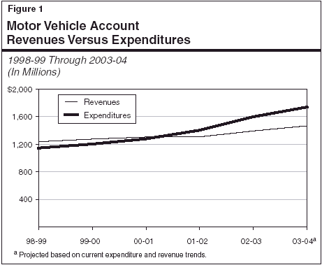 In the last few years, modest growth in revenues to the Motor Vehicle Account (MVA) has not kept pace with rising expenses such as employee benefits and new antiterror programs. If no corrective actions are taken and federal funds for homeland security are not received, the MVA will face a substantial shortfall by the end of 2003-04 that will worsen in future budget years. The budget proposes to bolster MVA's condition largely through a combination of fee and penalty enhancements and a reduction in the California Highway Patrol's reliance on MVA by providing the department with funding from other sources.