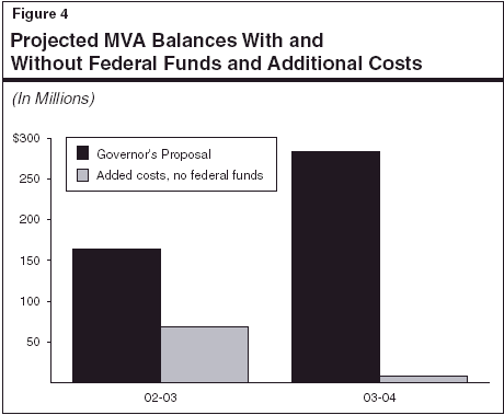 Thus, even if MVA revenues come in on target in the budget year, the 2003-04 projected year-end balance could be less than $10 million if salaries and benefits rise to their anticipated higher levels, and if anti-terror federal funds do not materialize. Figure 4 shows the account's year-end balances as projected by the budget and if MVA expenditures are higher as a result of other factors.