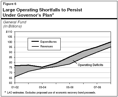 Does the Budget Push Too Much Off Into the Future? One of the main features of recent budgets is that they have not meaningfully addressed the ongoing structural budget shortfalls that have confronted the state since 2001-02. While this budget proposal does contain large amounts of real and ongoing savings, it still leaves a significant amount of the underlying structural problem for future years. As noted above, we estimate that the Governor's plan would leave the state with a budget shortfall of roughly $7 billion in 2005-06, even if all of the savings and other solution assumptions in the plan were fully realized. Furthermore, the unaddressed budget shortfall would be even larger if some or all of the risks noted above materialize. The fundamental issue for the Legislature is thus how the projected multibillion-dollar out-year problem should be dealt with and whether it should be more completely addressed at this time.