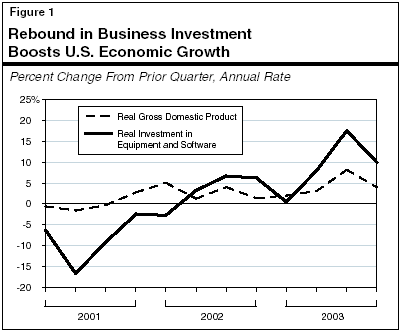 As shown in Figure 1, business investment finally joined the expansion in the second half of 2003, and is slated to exhibit added strength throughout the forecast period. Led by major increases in computer and software spending, total investment in equipment jumped by 18 percent in the third quarter and 10 percent in the final quarter of 2003. These increases—coupled with solid gains in consumer spending, housing activity, and exports—contributed to a 6 percent annual rate of increase in gross domestic product (GDP) during the second half of the year.
