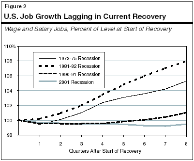 The one "weak link" in this expansion has been jobs. Employment growth normally lags in economic upturns, as businesses initially add hours and utilize their existing workforce more intensively before hiring new workers. However, the lag in this expansion between when production improved and job growth occurred has been much longer than in the past. This is depicted in Figure 2 (next page), which compares job performance in the respective economic recoveries following the 1973-75, 1981-82, and 1990-91 recessions. It indicates that: