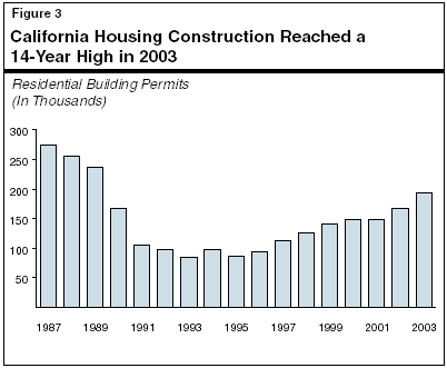 California Home Prices. The median home price in California has nearly doubled in the past four years, and as of late 2003 was nearly $400,000. Most economists still do not characterize the current situation as a "speculative bubble" that is about to burst. Rather, they attribute the recent price increases primarily to such basic economic factors as rising demographic-based demand, limited availability of developable land in many key population areas, and low interest rates. These rates have enabled households to take on much larger mortgages relative to their income levels than in the past. However, regardless of whether or not present conditions can be characterized as a speculative bubble, there is no question that housing prices in many areas of the state are vulnerable to setbacks—should weaker-than-expected economic growth materialize or a significant rise in interest rates from current levels occur.