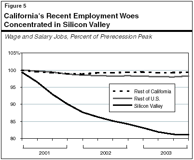 Virtually All of the Weakness Concentrated in Silicon Valley. A closer look at the state's geographic employment patterns reveals that virtually all of its slightly weaker-than-average performance is related to the major economic downturn that has occurred in the Bay Area's Silicon Valley. Figure 5 shows that total employment fell by 19 percent in the San Jose metropolitan area between the first quarter of 2001 and the fourth quarter of 2003. By contrast, the rest of the state has lost just 1 percent of its employment base, or proportionally less than the rest of the nation.