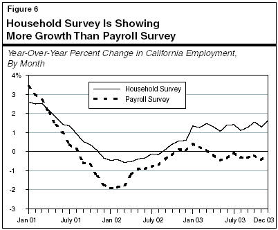 Household Employment Survey Showing More Growth. As discussed in detail in our November fiscal outlook and noted above, employment data come from two sources—a monthly payroll survey of employers and a household survey. There is some evidence that the payroll survey is currently understating employment performance. As shown in Figure 6, the separate survey of households—which also is used to calculate the unemployment rate and provides data on labor force characteristics—shows a state employment gain of 1.6 percent (256,000 jobs) between December 2002 and December 2003. This compares to the payroll survey estimate of a 0.2 percent loss (32,000 jobs) during the same period.