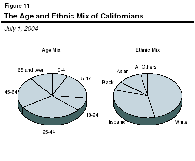 The implications of demographic trends for the budget depend not only on the total number of Californians, but also on their characteristics. California is well known for having one of the world's most dynamic and diverse populations, including an increasingly rich ethnic mix; a large number of in-migrants; and a wide geographic dispersion encompassing highly urban, suburban, and rural lifestyles. The state's current age and ethnic mix is shown in Figure 11.