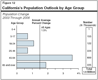 Regarding ethnicity, we project a continuing trend toward increased diversity, as the whites' share drifts down and that for Hispanics and a wide variety of other ethnic groups rises. The age-related characteristics of California's population growth are especially important from a budgetary perspective, given their implications for such program areas as education, health care, and social services. Figure 12 shows our forecasts for both the percentage and numeric changes in different population groups. The 45-to-64 age group (baby boomers) continues to be the fastest growing segment of the population. About 900,000 new people are expected to move into this age category over the next three years, as the tail end of the baby-boom generation moves into its mid-40s.