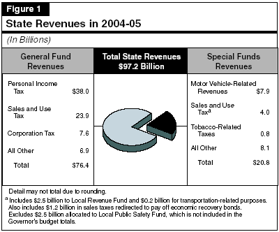 The 2004-05 Governor's Budget projects that California's state government will receive over $97 billion in revenues during 2004-05, a $4.3 billion (1.3 percent) increase from the current year. These revenues are deposited into either the General Fund or a variety of special funds. Figure 1 shows that: