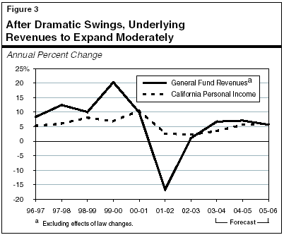 2005-06 Outlook. We forecast that total revenues and transfers will increase from the current year by about $2.5 billion (3.3 percent) in 2005-06, to $78.4 billion. Excluding the impact of the Governor's policy proposals on the 2004-05 and 2005-06 revenue totals, the underlying increase would be a more robust 5.7 percent. This increase is consistent with our assumption that the economic rebound will continue in 2005, boosting revenues from the state's main taxes during the year.