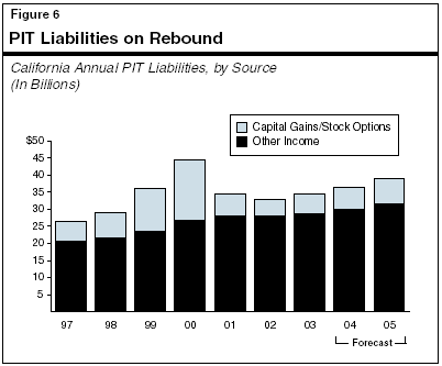 Our forecast of PIT liabilities is shown in Figure 6. After soaring in the late 1990s, PIT liabilities plunged in 2001 by nearly $10 billion (over 20 percent) from their unsustainable peak reached in 2000, and by another $1.5 billion in 2002. Liabilities then experienced a modest partial recovery in 2003. We expect them to grow at a stronger pace in both 2004 and 2005, reflecting healthy gains from most major income sources. Specifically: