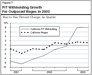 Based on our estimated changes in PIT liabilities, we forecast that fiscal-year PIT receipts will total $34.6 billion in 2003-04, and then expand to $37.4 billion in 2004-05 and $40.1 billion in 2005-06. Compared to the budget forecast, our current projection of PIT revenues is down by $477 million in the current year and by $613 million in 2004-05—or $1.1 billion for the two years combined. As noted earlier and discussed further in the nearby shaded box, our lower PIT estimates primarily reflect our reassessment of historical withholding and wage data for 2003, which suggests that PIT liabilities are less than assumed in the budget forecast.