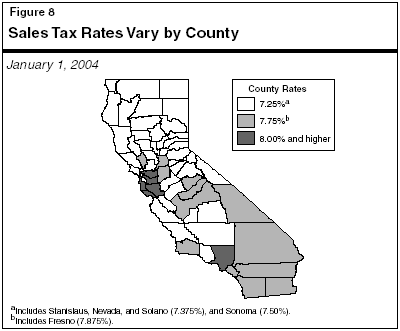 Combined SUT Rates. The combined state and local SUT rate varies significantly across California due to differences in the local optional rates that are levied. As depicted in Figure 8, the combined SUT rate currently ranges from 7.25 percent (for those counties with no optional rates) up to 8.5 percent (for the City and County of San Francisco). No county currently imposes the maximum allowable SUT rate of 8.75 percent.