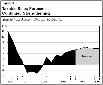 Outlook—Continued Growth in 2004 and 2005. We forecast that taxable sales will continue to strengthen, increasing by 5.9 percent in 2004 and 5.8 percent 2005 (see Figure 9). The main positive forces will continue to be healthy business investment and home construction. Consumer spending is forecast to grow moderately, roughly in line with personal income. As with the rest of the country, we believe that household spending in California will be somewhat restrained by high levels of consumer debt.