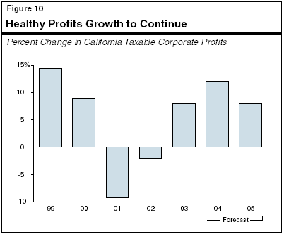 The key determinant of CT receipts is the strength of corporate profits reported on California tax returns by businesses. After falling in 2001 and most of 2002, California earnings rebounded in 2003 (see Figure 10). This turn-around is partly related to the intensive cost-cutting efforts undertaken during the prior two years and the related productivity gains that materialized in 2003. Looking ahead, we forecast that taxable California corporate profits will increase by another 12 percent in 2004 and by 9.5 percent in 2005. While productivity growth will continue to play a key role, the majority of the anticipated profit growth during the next two years is related to expanded sales both at home and abroad.