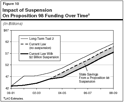Legislature Can Eliminate Prior- and Current-Year Proposition 98 Obligations Through Suspension. For 2002-03 and 2003-04, the Governor proposes to fund Proposition 98 a total of $966 million below the existing minimum guarantee levels. The budget, however, does not propose suspension in these years. Thus, for these years the state would need at some future time to appropriate additional resources to "settle up" to the minimum guarantee. Under the Governor's proposal, the state would not begin paying the settle-up obligation of $966 million until 2006-07. This effectively creates a $966 million loan from Proposition 98 to the General Fund until that time. While this would help the state's balance sheet in the short run, the "tab" would have to be paid in 2006-07. Given that the budget does not fully address the state's structural problem (see "Part I" of the 2004-05 Budget: Perspectives and Issues), the loan would add to the state's problem when the settle-up payments were made in 2006-07.
