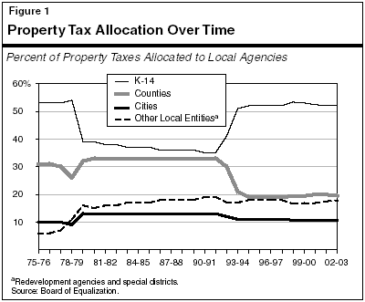 As Figure 1 shows, immediately after Proposition 13's passage, the Legislature established a property tax allocation system that reduced the share of property tax revenues allocated to educational local agencies from a statewide average of 54 percent to 39 percent—and increased the share of property taxes allocated to cities, counties, and special districts. (The state replaced the shifted K-14 district property taxes with increased state funding.) Specific property tax allocation formulas then were assigned to every area of the state, designating the portion of the property tax to be allocated to each local agency serving the area. These property tax allocation shares were based on each agency's proportionate share of property taxes in the mid-1970s and are commonly referred to as "AB 8" shares, after the bill that created this property tax allocation system—Chapter 282, Statutes of 1979 (AB 8, L. Greene). With the exception of several relatively minor changes, the state did not alter these AB 8 shares until the early 1990s.