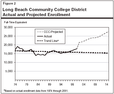 For example, in Figure 2 it can be seen that the Long Beach Community College District (CCD) had its peak enrollment in 1975 of about 19,000 full-time equivalent (FTE) students and has not had enrollment above that level since then. The trend line for the district, based on the actual enrollments between 1974 and 2001, shows a slight declining rate of enrollment, which would result in an enrollment of a little over 15,000 FTE students in 2015 (a 12 percent decline). The chancellor's office, however, projects an enrollment of over 27,000 FTE students in 2015—an increase of almost 55 percent. While there could be social or demographic reasons behind this projection—for example, a rapid increase in the area's high school population—we are not aware of what they could be in this particular case. The chancellor's office projection seems to be based largely on a recent slight uptick in enrollment. As Figure 2 shows, however, this increase can be viewed as a typical short-run fluctuation in the district's long-run "flat" enrollment picture.
