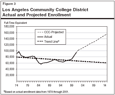 The community colleges chancellors office prepares projections annually of enrollment trends at each district, and the districts use these projections to justify construction of new buildings. These projections, however, appear to significantly overstate future enrollment in many cases—and therefore may be overstating the need to construct some new facilities. To illustrate, Figures 2 and 3 show enrollment history and projections for two large community college districts. The solid black line in each figure shows the actual enrollments in the district from 1974 to 2001. The long-dash line shows the enrollment the chancellor's office projected for 2002 through 2015. The short-dash line shows the historical trend line.