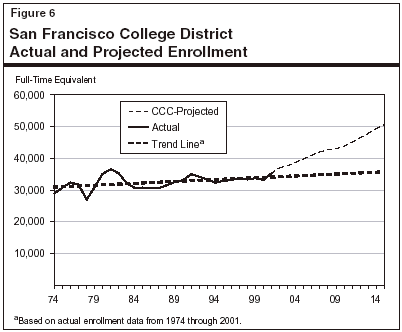 Enrollment Projections Not Justified. The community colleges chancellor's office prepares projections of enrollment trends for all districts. The San Francisco district relies on these projections in explaining why it believes this project is needed. We find these projections to be overly optimistic. The chancellor's office projections show enrollment in the San Francisco Community College District (SFCCD) increasing to almost 51,000 FTE students by 2015—a 43 percent increase over the actual enrollment in 2001. However, enrollment growth of this magnitude is inconsistent with the enrollment trend for the district over the last 25 years—and with population projections for San Francisco County and projections of K-12 enrollment in the county.