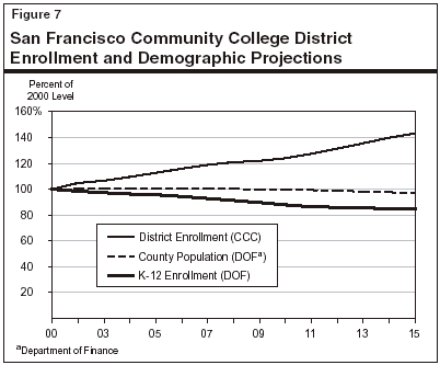 The trend line estimate may even overstate likely future enrollment in the district. There are two key factors that could cause the district's enrollment growth rate to increase substantially: (1) a rapidly growing local population or (2) rapid growth in enrollment in local K-12 schools. But neither of these situations is the case in San Francisco County. As Figure 7 shows, the Department of Finance projects the general population of the county will decline slightly (from 787,500 to 763,880—a difference of about 3 percent) between 2000 and 2015, and that the K-12 student enrollment in the county will decline from about 61,700 to 51,300, a 17 percent decrease. (Adjacent counties have similarly static populations and in any case do not supply many students to the SFCCD). These estimates indicate that the district's enrollment is more likely to decline over the next decade.